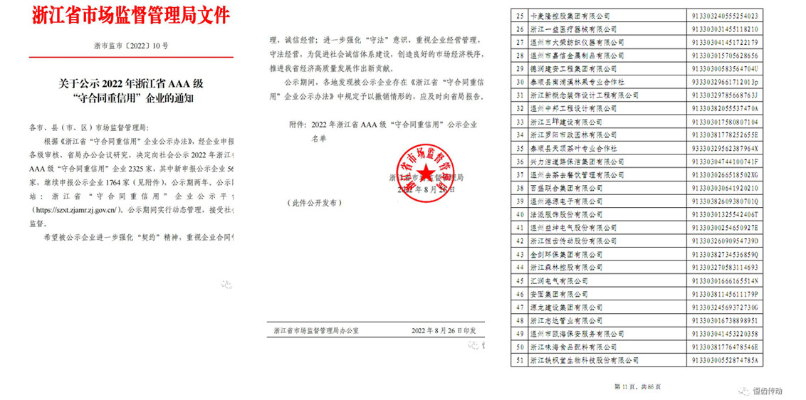 恒齒傳動擬評為2022年浙江省3A級“守合同重信用”企業